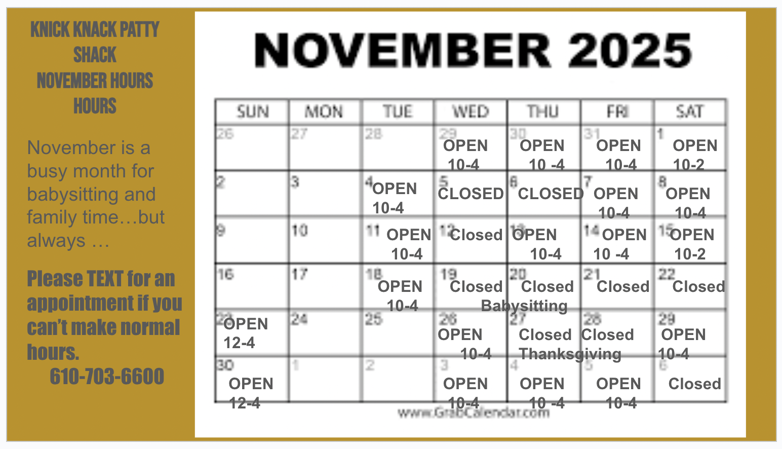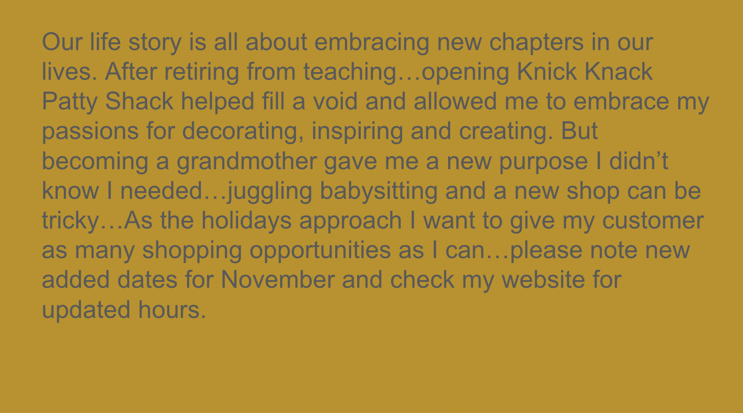 They say patience is a virtue…in all areas of my life I have learned that good things happen to those who wait…easier said then done especially for someone who has self diagnosed ADHD and can’t sit still…so this journey to opening has been frustrating….but after eight months of being patient dealing with zoning issues, the help of many friends, skipping over 2 seasons , rearranging the shop at least 6 times, and adding lots of inventory …it is finally time to welcome you all to the Knick Knack Patty Shopping experience! We got our PERMIT!